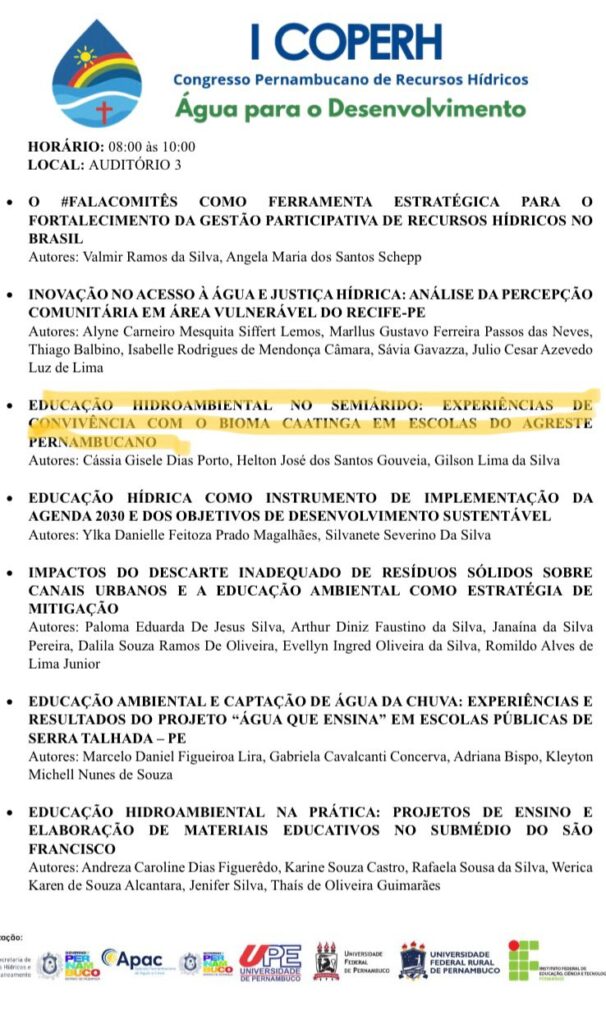 Durante o congresso, foram apresentados trabalhos desenvolvidos no âmbito do projeto, com ênfase nas ações de educação hidroambiental realizadas em escolas do Agreste pernambucano. As iniciativas destacaram a importância da convivência com o bioma Caatinga, da valorização dos saberes locais e da formação de uma consciência crítica acerca do uso e conservação da água.