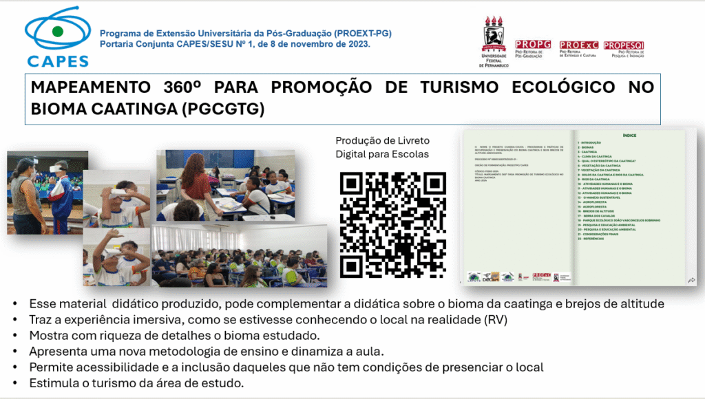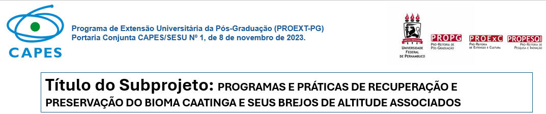 O ano de 2025 marcou um período de consolidação, inovação e ampliação das ações do Projeto Bioma Caatinga, desenvolvido no âmbito do Programa de Extensão Universitária da Pós-Graduação (PROEXT-PG) da Universidade Federal de Pernambuco (UFPE). As atividades realizadas reafirmaram o compromisso institucional com a preservação, recuperação e valorização do Bioma Caatinga e de seus brejos de altitude, integrando ciência, extensão e impacto social.